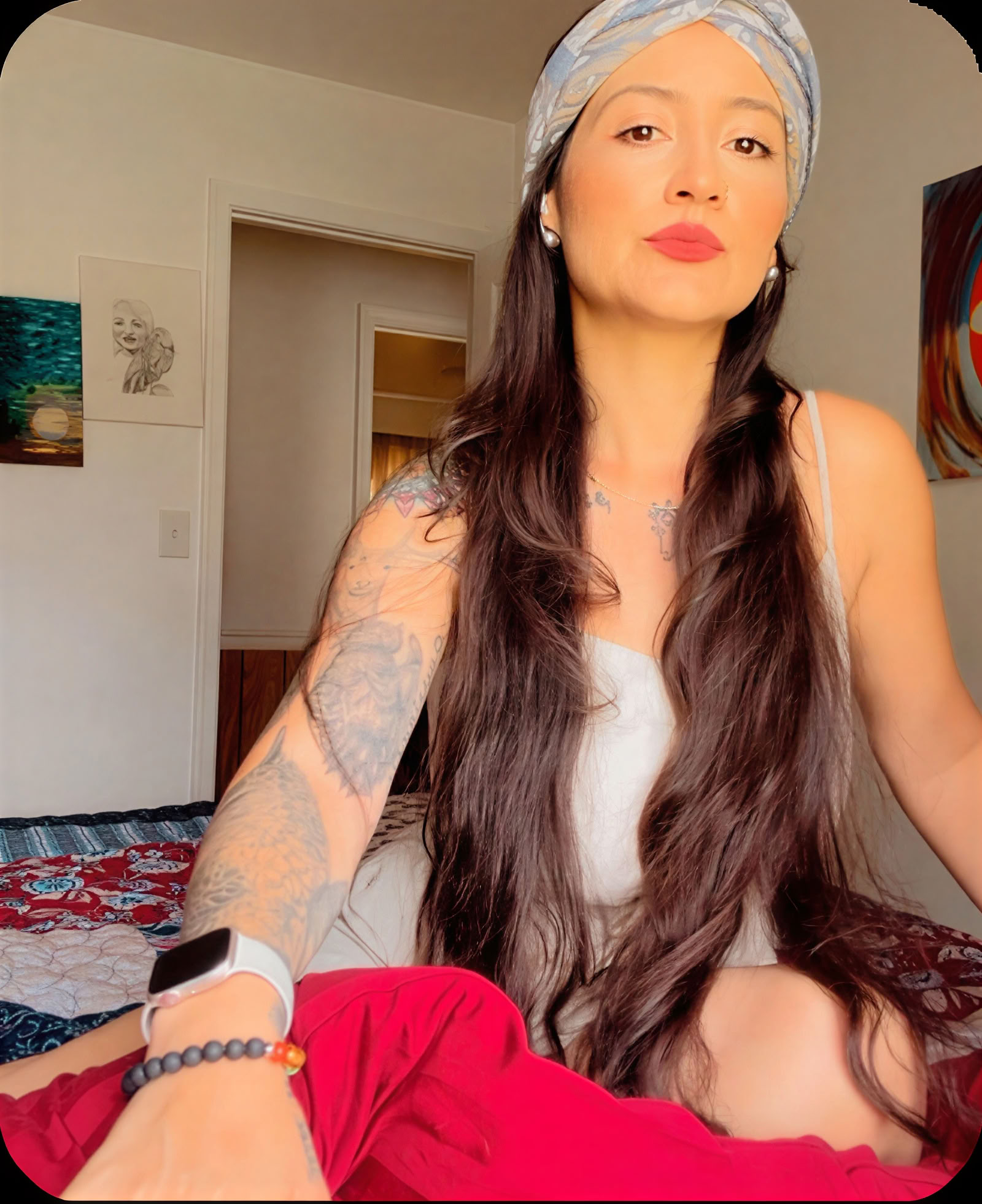 She facilitates ancestral medicines such as ayahuasca, kambo, sananga, mambe, ambil, rape, and cocoa, learned through apprenticeship with a guide and through her own personal practice. Her intention is to share rites of passage, including the blessing of the path for pregnant families and future generations.